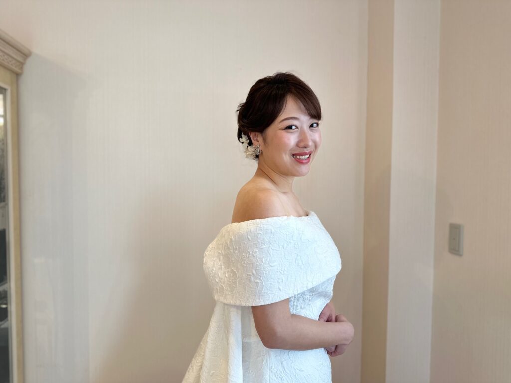 スッキリとしたドレスで肩のオフショルダーが外せます。アップスタイルとダウンスタイルで変化を楽しみました。あいにくの雨で店舗室内の綺麗な白の壁前でスタジオ写真のように取れました。